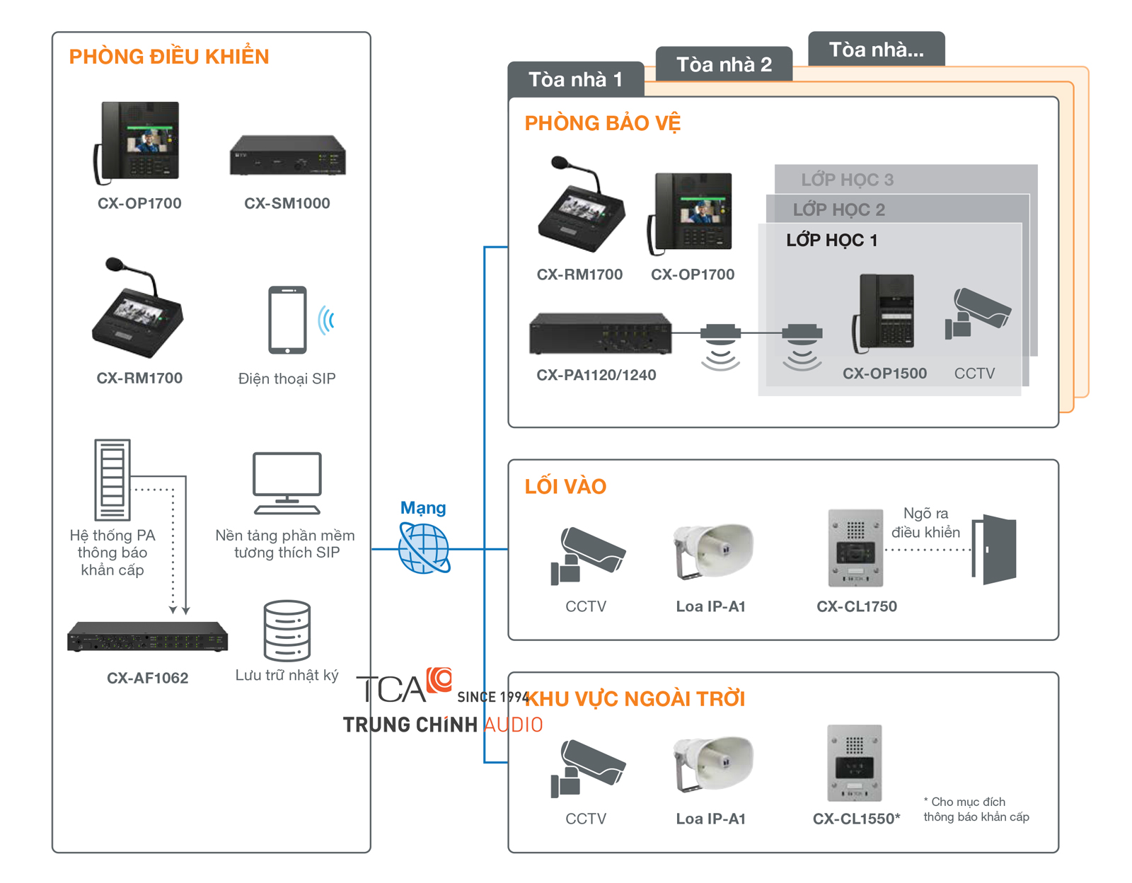 TOA CX-1000 là dòng hệ thống âm thanh – liên lạc – thông báo IP thế hệ mới, được thiết kế như một nền tảng hợp nhất toàn diện giữa thoại, hình ảnh, truyền thông đa điểm và điều khiển thiết bị ngoại vi. Đây là dòng sản phẩm chiến lược của TOA trong giai đoạn chuyển dịch sang hạ tầng IP, đáp ứng yêu cầu ngày càng cao về an ninh, vận hành tập trung và giám sát thời gian thực trong các công trình quy mô lớn như trường đại học, nhà máy, tòa nhà văn phòng, bãi đỗ xe, bệnh viện hay các khu vực công cộng.